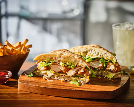 Sliced sirloin and mozzarella cheese topped with mushrooms and our Lombardo Marsala wine sauce on focaccia bread. Served with your choice of a side and beverage.